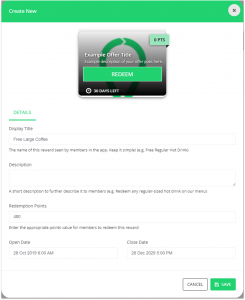 - In the popup that appears, fill in the details of the reward you want to create. Make sure you determine an open date you are comfortable with, as this reward will be active (viewable by all Locify members) from the open date. Click Save when done.